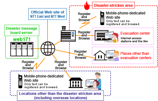 In a natural disaster, this service enables residents in the disaster-stricken area (including evacuation centers) to access the message board site via the Internet and to register message information (in text, voice, or image format) using the relevant telephone number as a key.