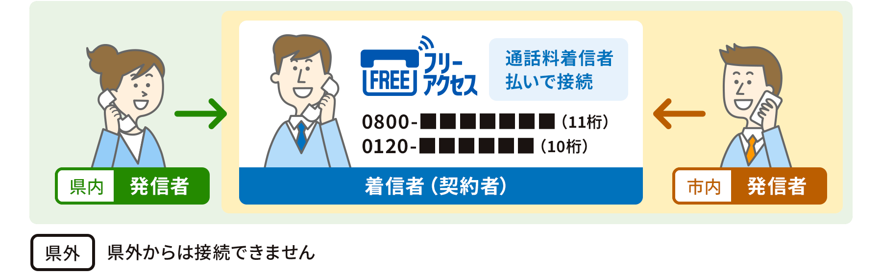 「0800」または「0120」で始まるサービス番号を使用し、通話料金を着信者が負担する同一府県内専用の通話料着払いサービスです。