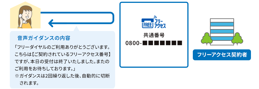 | 2:フリーダイヤル+受付終了 | フリーダイヤルのご利用ありがとうございます。こちらは【AN番号】 ですが、本日の受付は終了いたしました。またのご利用をお待ちしております。 |