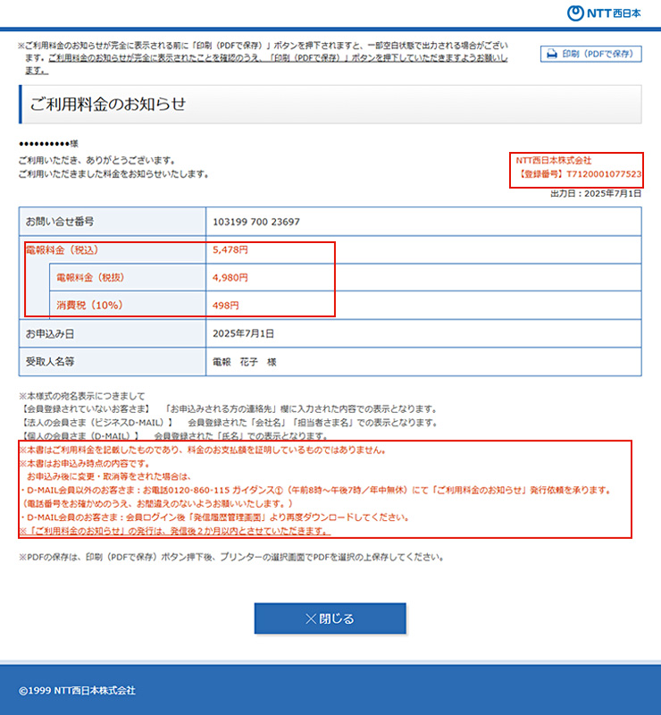D-MAILサイトで提供中の「ご利用料金のお知らせ」の一部表記の変更を以て、適格請求書と代えさせていただきます。