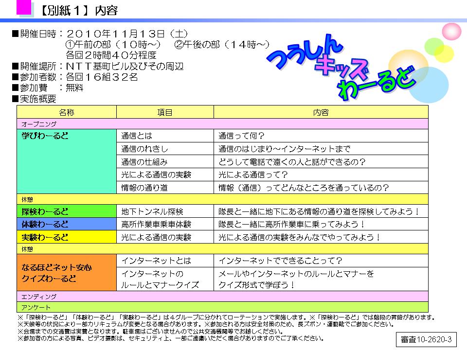 「学びわーるど」「探検わーるど」「体験わーるど」「実験わーるど」「なるほどネット安心クイズわーるど」の5つの「わ ーるど」をご用意し、通信(電話やインターネット)について、実験や体験を通して楽しく学んでいただきます(詳細は別紙1参照)。 |