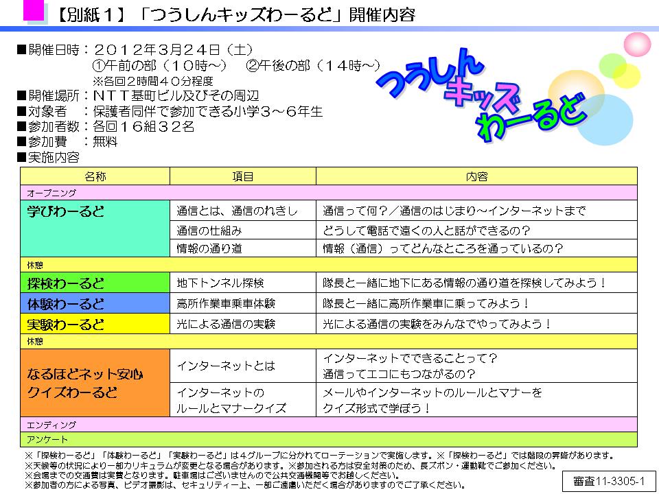 | 「学びわーるど」「探検わーるど」「体験わーるど」「実験わーるど」「なるほどネット安心クイズわーるど」の5つの「わーるど」をご用意し、通信(電話やインターネット)について、実験や体験を通して楽しく学んでいただきます(詳細は別紙1参照)。 |
