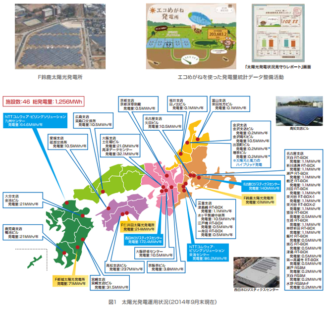 NTT西日本管内で稼動する46施設で年間の発電量が1,256MWhになりました。(図1)