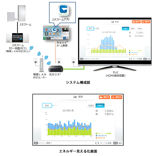 今回、大阪ガスとアライアンスを組み、大阪ガスが提供する家庭用燃料電池「エネファーム」の操作や情報閲覧を「光BOX+」上で可能にする「エネファームアプリ」を提供いたします。
