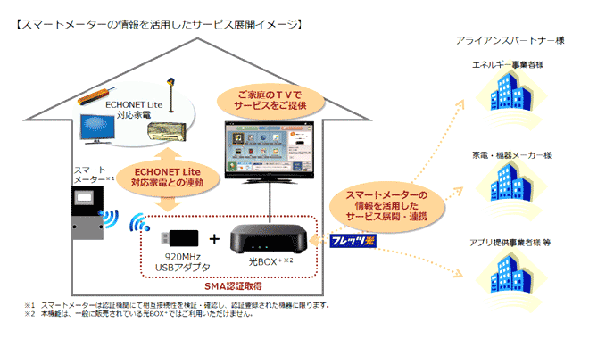 これにより、光BOX、920MHz USBアダプタを経由して取得したスマートメーターのデータをインターネットを通じて収集し、各種アライアンスパートナー様と連携することで、利用者様が、より便利に賢くエネルギーを利用できる、すなわち温暖化防止に貢献するサービスの創出が可能となります。