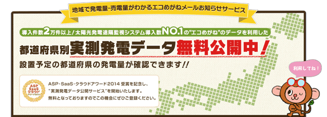 NTT西日本グループのNTTスマイルエナジー社では、ASP・SaaS・クラウドアワード2014受賞を記念し、太陽光発電遠隔システムとして利用されているエコめがねの、実測発電データ公開を実施しています。