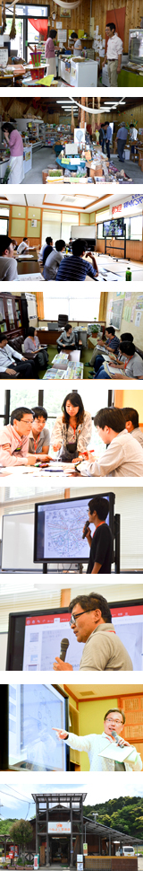 その後ワークショップで、参加者はIターンで移住し駐在所、小学校、介護施設などに就職するという設定で、班に分かれて地域の方とふれあい、当該地域の共助関係の可視化を行いました。