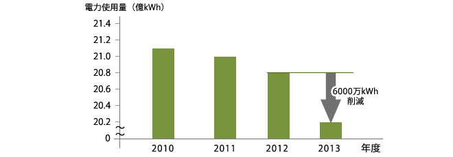 環境グランドデザインという中長期計画を定め、2020年に2010年度比20%以上(自社利用の電力使用量は40%以上)電力削減する目標を定めており、その目標達成のために電力削減を進めています。2013年度は、電力量の見える化、削減施策の進捗の見える化などマネジメントを強化することで、一般的な家庭で使われる電力消費量の約2万世帯※にあたる6000万kwhの電力を削減しました。