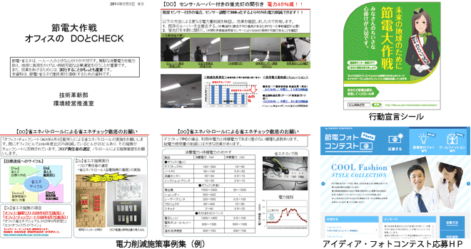 2013年度は、電力の見える化と同時に、目標の設定(2010年度比20%削減)し、一人ひとりが電力削減の行動ができるように照明照度の適正化の方法、各種機器の電力使用量の状況、電力見える化データの利用方法、空調設定の工夫方法、各組織での電力削減の工夫などの電力削減施策をまとめた事例集を作成し展開しました。