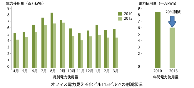 1ヶ月毎に電力会社から送付される請求書を元に電力使用量の見える化を実施するとともに、PDCAサイクルの短縮をはかることで電力削減を進めるため、30分毎の電力使用量の見える化をグループ会社のNTTファシリティーズと進めてきています。2013年度末には、約450ビルで約50%の電力使用量が把握できるようになっています。そのうち事務所として利用するオフィスビルでは115ビルに設置され、オフィスビルでの電力使用量の80%が随時把握できるようにしています。