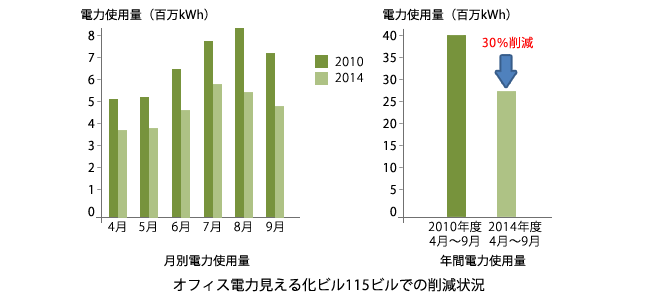 電力見える化実施のオフィス115ビルでの電力削減の実績値、8月は2010年度比37%の削減がはかれました。4月〜9月までを比較すると、2010年度比30%削減となっています。