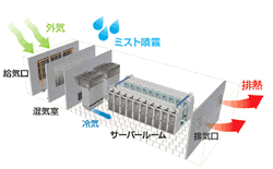 「ミスト併用直接外気空冷システム(仮称)」は「空冷ヒートポンプパッケージによる従来からの空調機冷却システム」に、「直接外気冷房システム」と「ミスト噴霧による蒸発冷却システム」を組み合わせたシステムです。外気の温湿度条件にあわせて効率的にシステムを制御することでデータセンターの空調消費電力の削減を図ります。