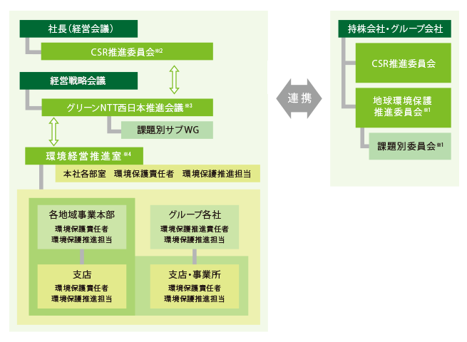 - ※4 NTTグループ各社とも連携しながら、グリーンNTT西日本推進WGの事務局として、NTT西日本グループの環境における方針、施策の検討、及びNTT西日本グループ各社への展開、進捗の共有を実施しています。