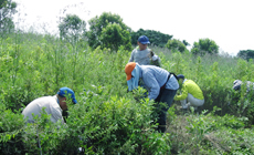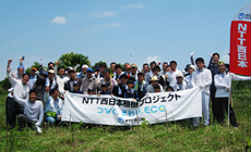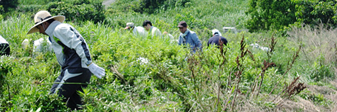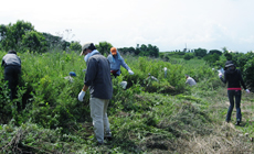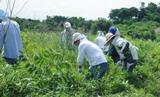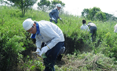 平成23年1月に第1回目の植樹会を、平成24年10月に第2回目の植樹会を開催し、合計660本の苗木を植樹しました。今回、苗木の成長を助けるために、草刈りを実施(約1000平米)。自働草刈り3台、鎌による手刈り44人による草刈を実施しました。草刈前は苗木が見つけられないくらい雑草がうっそうと生い茂っていましたが、草刈後は、太陽の光を浴びられるよう、雑草が刈取られ、苗木の姿が見えるようになりました。
