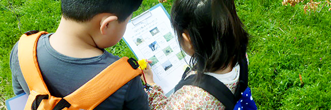 生物多様性保全のためには自然・環境のことを知っていただく活動も重要です。今回は植樹会の午後の時間を利用して、ゲームを通して身近な自然を発見する「フィールドビンゴ」を実施しました。