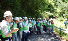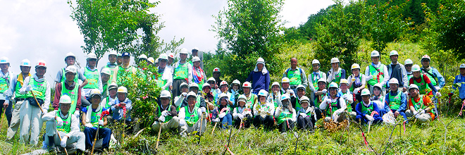 平成25年6月16日(日)、NTT西日本グループ和歌山ブロックの社員、OB等80名が田辺市龍神村にある『輝きの森』の下草刈を行いました。