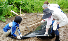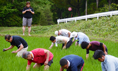 田んぼでの草取りは、おコメの質にとても影響を与えるそうです。草につく虫が増えると、おコメの中に黒い斑点が入り、そのおコメが混ざらないようにするには草取りが重要な役目を果たすのだそうです。また草は抜くのでなく、田んぼに埋めて成育を止めます。そんなことを教わりながら、棚田の手入れ班は、全員裸足で棚田の中に入り、草取りを実施。おたまじゃくしや、ヒルがいる田んぼの中を、うまく歩き、草を埋めて行く者、転んで泥だらけになる者もいました。畑班は、周辺の草刈と、作物の近くに草が生えないようにするマルチングの作業に汗を流しました。