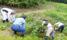 石川県の奥能登は、千枚田などでも有名な棚田が沢山ある地域です。吉ヶ池もそんな奥能登にある静かな集落で、農村ボランティアなどが活発な場所です。今回は、石川県環境部 里山創成室にご紹介いただき、奥能登棚田ネットワークの田畑さん他、吉ヶ池のみなさんの指導のもと、NTT西日本グループのみどりいっぱいプロジェクト研修会の一環として、棚田の手入れ(草取り)と、畑周辺の(草取り・マルチング)ボランティアを実施しました。