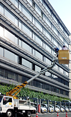 作業には、NTTが屋外の電柱などで作業を行うバケット車という高所作業車を利用しました。バケット車の操作は、弊社の高所作業車教育講師に行ってもらい、部署を超えての合同作業となりました。