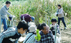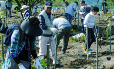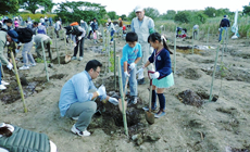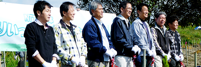 大阪府堺市共生の森での活動は、産業廃棄物の埋立地を自然の力を借りてみどりいっぱいにしようという活動です。これまでWebビリングの契約数に応じて植樹を行い、既に1300本を植樹しています。今後は、フレッツ光回線をご契約いただいている数に連動した本数の植樹を予定しています。