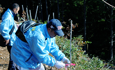 開会式では、地球緑化の会 黄檗(きわだ)会長挨拶の後、上山支店長から「今回だけではなく、継続的な活動にしていきたい。」との挨拶があり、地球緑化の会の指導のもと、下草刈りと幼木を保護するため、ピンクのリボンを結びつける作業を行いました。