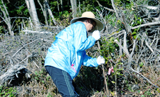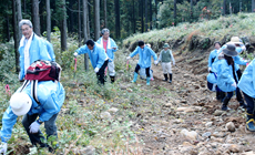 参加者は、約3キロの山道を登り「地球緑化の森」に到着。