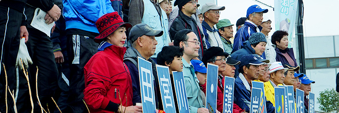 最後に、「みどりいっぱいプロジェクト」の幟を掲げ、きれいになった田宮川堤防を背景に参加者全員で記念撮影を行いました。