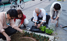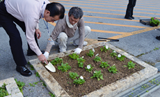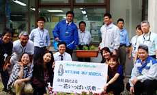 当日は晴れ、強い西日が射し込む中、NTT西日本グループ社員約60名の参加により、まず雑草の除去、荒廃した土を耕し堆肥をくわえるなど、全員、土いじりを楽しみながらも手際よく花壇の環境を整えました。