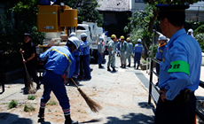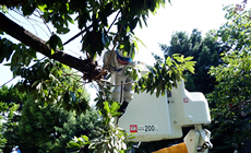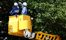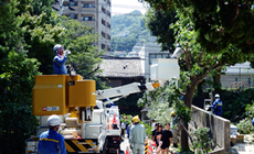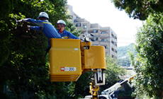 作業はバケット車4台、軽トラック1台を使用して剪定・清掃を行ない、剪定した枝葉はロープにより下ろすなど安全を第一に、熱中症等にも十分注意を払いながら実施し、約2時間の作業により見通しを確保することができました。