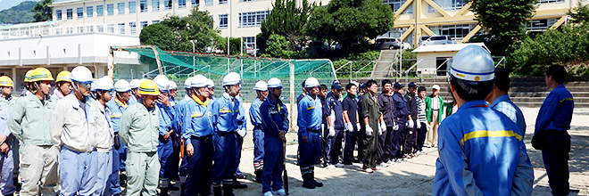 8月28日(水)の長崎市立桜馬場中学校では、午前10時から学校関係者、警察署のほか日本公衆電話会、通信建設会社、各協力会社、NTT西日本ホームテクノ九州、長崎事業部の参加者全員で開会式をおこない、小林NTT西日本長崎支店長、桜馬場中学校教頭、長崎警察署矢上交番所長よりそれぞれ挨拶を受けた後、全員で安全唱和をおこない各グループごとにKYTを実施し、作業に取りかかりました。
