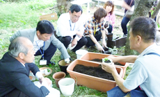 お渡し式では、大きな鉢への植替え教室を行い、里親のみなさんが持参した自分の鉢にその場で植え替えを行いました。里親のみなさんが育てた葵は、京都の葵祭で使用できるよう、来年春に株分けし、上賀茂神社に栽植します。