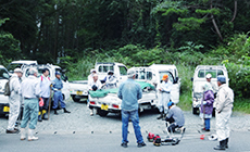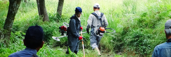 輪地切りは、草原の野焼きを行う前に、周辺の植林地や建物などに延焼しないよう防火帯を作るための草刈り作業で、多くの人出と労力を要します。また、多くの場合傾斜がきつく、人力で刈払い機による作業のため、危険が伴う作業でもあります。近年の畜産農家の減少や、過疎化・高齢化による労力不足により、草原が放置され自然の遷移による森林化が進み、草原の景観が消えていくのではと心配されています。