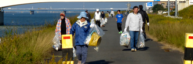 参加者は、担当地区の「里親」として「養子」である河川敷の清掃・美化活動を定期的(年3回以上)に行い、吉野川左岸河口から上流1400mから2000m間の堤防及び河川敷600メートル区間を清掃・美化活動を行なうものです。