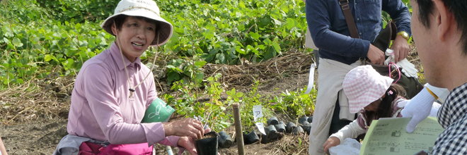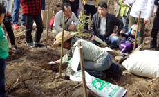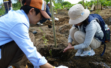 植樹の方法としては、苗木の根付きをよくするために、苗木周囲40cm、深さ30cmの土をほぐし、肥料をまぜ、苗木を植樹し、苗木のまわりには、保水できるように斜面下側に保水堰を作り、雑草に栄養が取られないようにマルチングと呼ばれる地面への覆いを施します。また、下草刈等の作業の際に苗木を発見しやすくするためにタグ付けも行いました。タグには、樹種名を記載し、裏には各参加者が苗木に対する愛着を持ってもらうようにと植樹した人の名前を記載しています。