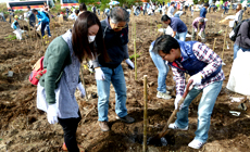 今回は、ヤマザクラ、アキニレ、ムクノキ、エノキ、クヌギ、ケヤキ、コナラ、イロハモミジ、クロマツ、ネズミモチの十種類合計約800本を用意しました。そのうち250本は、有志社員が自分たちで育てた苗木を植樹しました。参加者は、遠くは宮崎県から、多くは関西圏から集まった社員や、社員のご家族、OBの皆さんで、例年の約3倍の総勢287名となりました。