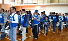 当日は、9時20分までに宮崎県青島青少年自然の家体育館に集合し、参加者は「NTT西日本・ダイナミックループ」入りビブスを全員が着用し、県内各地より本ボランティアに参加した約500名の県民と一緒に作業を行いました。