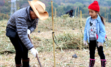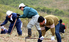 今年は、残りの0.2haで植樹を実施。おおいた森林組合の指導で緩傾斜地に深さ30cmの植穴を掘り、もみじやカエデ、桜、コナラなど広葉樹の苗木300本を植えました。植え付け後は、山間地の強風から守るため添木にしっかりと結び付け、苗木の成長を願いました。
