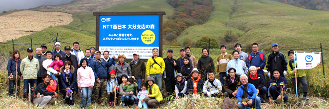 昨年11月に「企業参画の森林(もり)づくり」に関する協定を締結した湯布院町塚原高原の「NTT西日本 大分支店の森」で、11月8日、社員・家族など45人が参加して植樹活動を行いました。