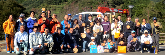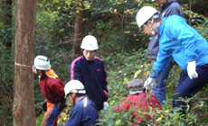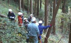 11月15日(土)、社員と家族等約50名が参加し、森林組合職員の方の指導の下、慣れないのこぎりを使い間伐作業と丸太切り競争等を行いました。
