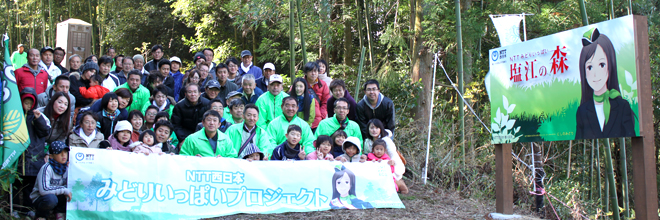 香川支店は、NTT西日本グループ全社で取り組んでいる「NTT西日本みどりいっぱいプロジェクト」の一環として、平成26年11月15日に高松市塩江町山林(高松市所有林)において、第1回「NTTみどりいっぱい塩江の森」植樹祭を実施しました。