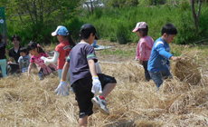 さらに、今回は参加してくれたお子さん達に、楽しく過ごしながら生物多様性について知ってもらうため、いきももの調査ゲームを併設しました。マルチングに使う藁を敷き詰めた区画の中にここ「共生の森」の森に棲む生き物の絵を描いたカードを多数しのばせておき、カードを探します。探したあとは、何を見つけたかの発表です。子ども達は、藁の中に飛び込むという日常ではできない遊びに、この上ない笑顔を沢山みせてくれました。