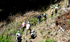 参加者は、森の斜面に散らばり、森林組合様の指導のもと、背丈の2倍ぐらいに成長した若竹を鎌で刈って行きます。