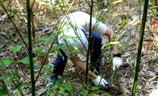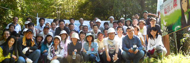 今回は、みどりいっぱい環境担当者研修会に参加した金沢から沖縄までの環境担当者58名で、2014年11月15日にヤマザクラを植えた場所に早くも生えてきた竹を伐採する活動を行いました。このまま放置すると、大きく成長する竹に太陽の光が遮断されて、ヤマザクラの成長が阻害されてしまうためです。