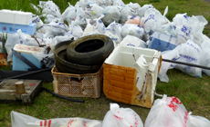 ゴミ収集の成果として、燃えるゴミ25袋、燃えないゴミ60袋(資原ゴミ含む)、自動車のタイヤ・ゴムホース(硬質)・鉄板・流木・発泡スチロールの箱・コンテナ(プラスチック)・ビデオデッキ等など大型ゴミもあり、前回3月に実施した時よりゴミの量がたくさんあり、約1時間で大きなゴミの山ができました。