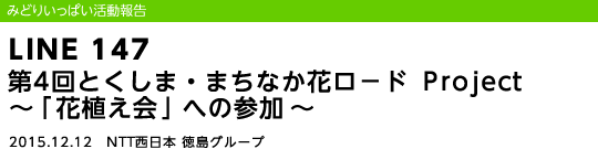 NTT西日本徳島支店グル−プでは、12月12日(土)に「みどりいっぱいプロジェクト」として、NPO法人「新町川を守る会」が実施している、「とくしま・まちなか花ロードProject」植栽活動に協賛企業として参加しました。