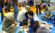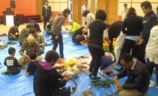 当日の交流活動は初参加の方が多かったのですが、あいにくの雨のため、間伐作業は中止となりました。かわりに、クリスマスリース作り体験とお楽しみ抽選会等を行いました。クリスマスリース作りは我が家のため、子どものためにお父さんも真剣に(?)取り組んでいました。