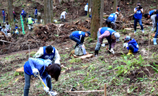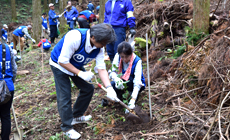 植樹では、森林管理署の職員より植樹の方法・注意点等の指導を受けながら、鹿侵入防止ネットが敷設された一画にイロハモミジや椿などおよそ1千本の苗木を植樹しました。山肌に足を滑らせながらも、元気に大きく育ってくれることを願い1本1本丁寧に植えました。