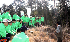 テレビ番組の「TVチャンピオン・無人島王決定戦」で優勝した野外活動家の二名良日(フタナ ヨシヒ)さんと「地球緑化の会」のご指導により、くぬぎの苗約200本の植林や育林のための下草刈りなどの作業を行いました。