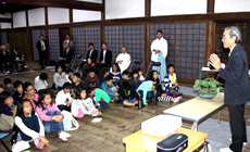 はじめに上間技術革新部長が挨拶。NTT西日本の社員も小学生のみなさんと同じように葵の里親となっていることや「みどりいっぱいプロジェクト」の取り組みについて紹介しました。次に門川京都市長が挨拶をされ、葵を育成する活動の中で上賀茂神社の歴史に触れることの大切さを語りました。