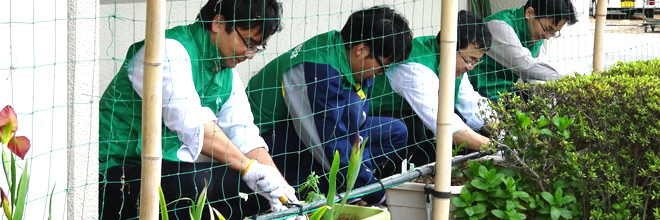 岐阜ビジネスユニットの加納ビルと梅ケ枝ビルにおいて、ビル周りや中庭を利用し、暑い夏の日差しから社屋の室温上昇を抑えることを主な目的として、つる性の植物などを栽培しています。
